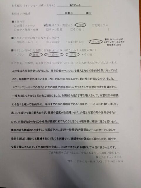 『この度は大変お世話になりました。電車沿線のマンションを購入したので音が少し気になっていたのと、高層階で景色は良い半面、西日がまともに当たるので、夏の西日が気になっていました。エアコンクリーニングの担当との方の雑談で数年前にImaガラスさんで内窓をつけて快適だから、一度相談してみらと言われご連絡しました。お聞きした通り丁寧な職人さんで、内窓以外の相談にも色々とのって頂きました。年末までの国の補助金があるとの事で、11月末にお願いしました。