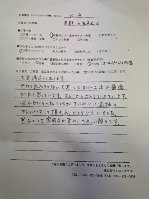 やはり出入りの多い大窓にはカバー工法が最適だったと思っています。スムーズに出入りできています。悩みながらの私でしたが、ていねいに適格にアドバイスして頂き、ありがとうございました。